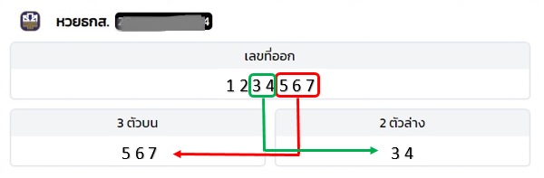 • 3 ตัวตรง คือหมายเลขสามตัวท้ายของผลการออกรางวัล (567) ดูตามเส้นสีแดง